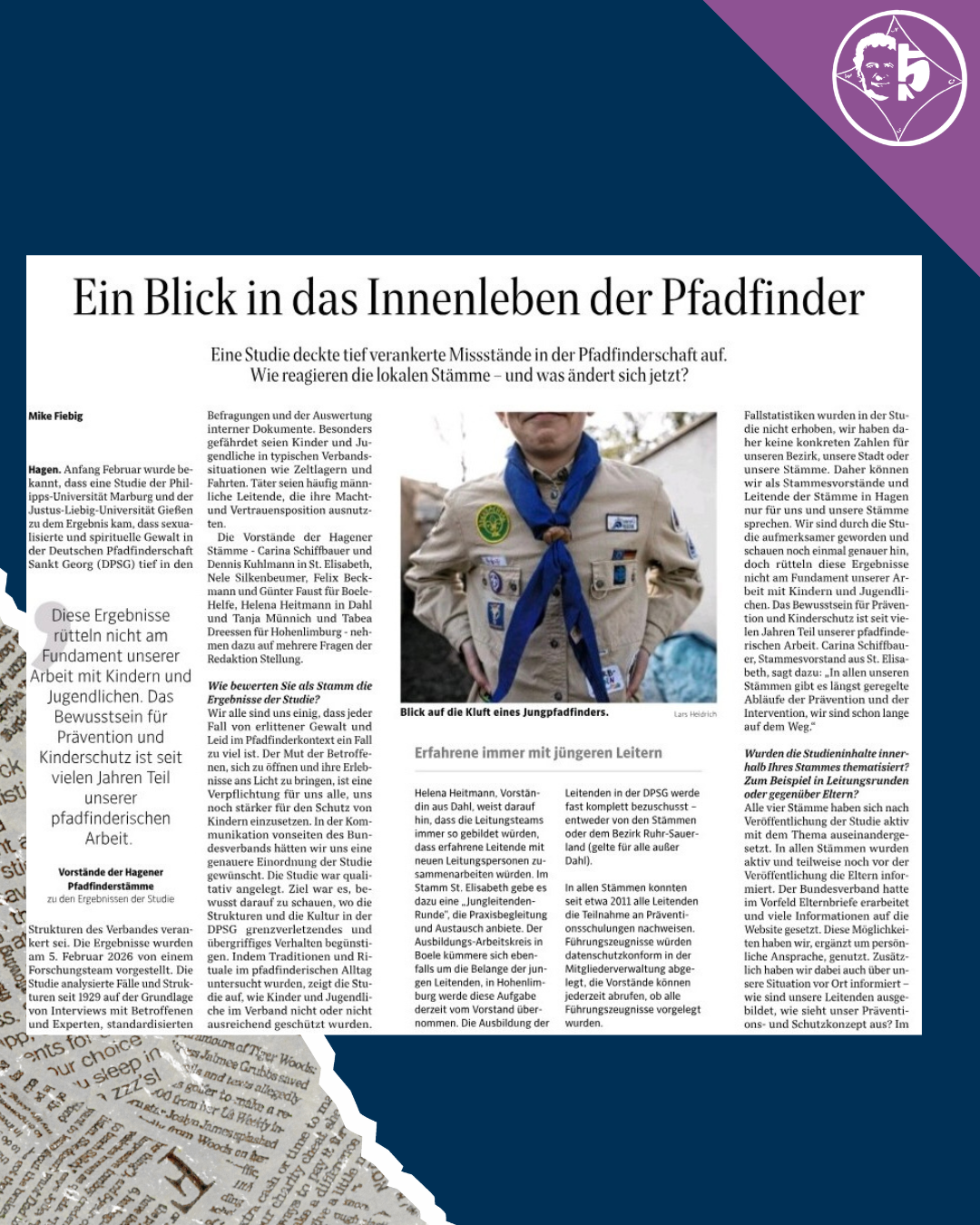 Anfang Februar veröffentlichte der DPSG-Bundesverband die Ergebnisse einer in Auftrag gegebenen Aufarbeitungsstudie zu sexualisierter und spiritueller Gewalt (hier geht es direkt zur Studie). Nun berichten die Hagener DPSG-Stämme aus Dahl/Rummenohl, Hagen, Boele-Helfe und Hohenlimburg in der Westfälischen Rundschau Hagen Süd, wie sie mit den Erkenntnissen der Studie umgehen. Den vollständigen Bericht vom 16.04.2026 gibt es […]