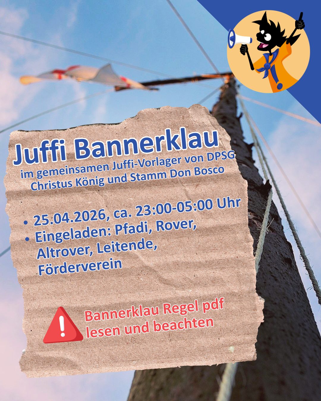 Vom 24.-26.04.2026 sind die Juffis auf den Höhen wieder im Vorlager. Dieses Jahr mit dem Stamm DPSG Christus König aus Duisburg und derer Juffi-Stufe zusammen. Um unsere Tradition des Bannerklaues den duisburgern Juffis zu zeigen, wird eine große Bannerwache veranstaltet. Eingeladen sind wie immer alle Stammesmitlieder von Stamm Don Bosco Dahl/Rummenohl und Christus König Duisburg […]