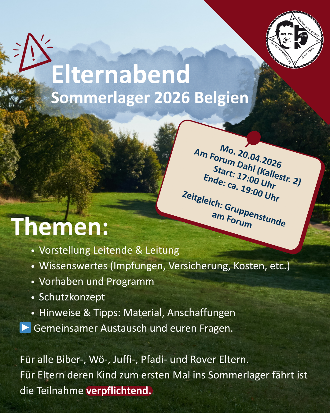 Der Elternabend (SOS-Abend) findet am 20.04.2026 um 17:00 Uhr im Forum in Dahl (Kallestraße 2) statt. Alle weiteren Informationen zum Sommerlager hier. An diesem Nachmittag/Abend stellen sich die Lagerleitung sowie die Leitendenrunde vor. Außerdem informieren wir euch über die geplanten Vorhaben und das Programm des Sommerlagers. Ein weiterer wichtiger Punkt ist das Thema Ausrüstung und […]