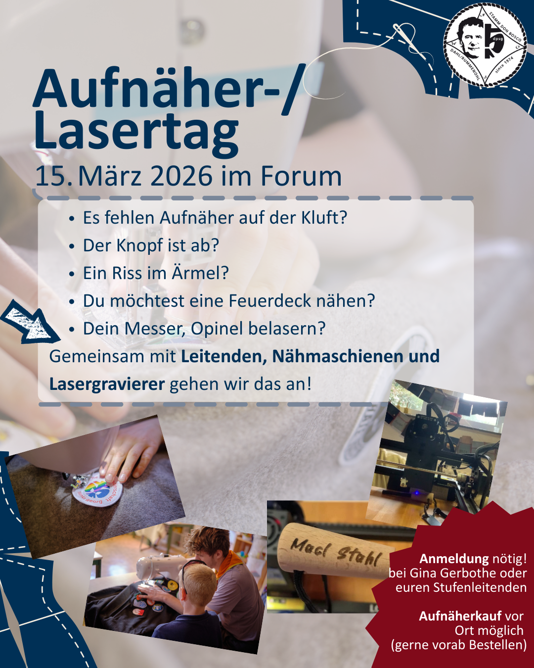Gebt uns bitte an, was ihr vorhabt (Aufnäher aufnähen, Feuerdecke nähen, Gravieren).