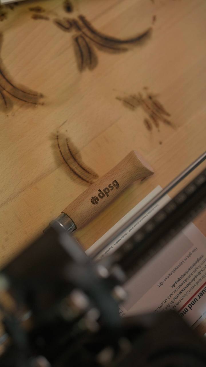 Unteranderem wurden Namen und Dschungeltiere auf Taschenmessergriffe gelasert und Untersetzer mit Stufenlogos.