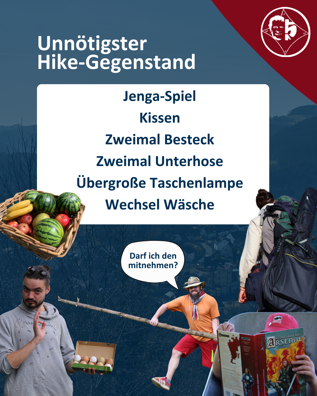 Jede*r kennt Gegenstände, die man auf dem Hike besser zu Hause gelassen hätte. Ob man wirklich an Kleidung und Unterwäsche sparen sollte, sei mal dahingestellt – das Jenga-Spiel sollte beim nächsten Mal aber definitiv am Lagerplatz bleiben.